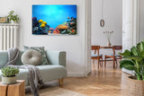 Leinwandbild Korallenriff Korallen unter Wasser Fotografie Fische - Dieses moderne und exklusive Wandbild ist ein echter Blickfang für Ihr Wohnzimmer, Schlafzimmer, Küche, Büro, Lounge, Garten oder anderen Einrichtungen. Dieser Fine Art Print wird auf hochwertiger Leinwand gedruckt und auf einen 2 cm starken Holzkeilrahmen gespannt. Gedruckt wird mit den besten Techniken auf dem Markt. Die Bilder bestechen durch eine sehr gute Farbqualität und Brillanz. Jedes Leinwandbild wird eigens in unserem Hause und individuell in Handarbeit (Made in Germany) angefertigt, somit ist ein hohes Maß an Qualität gewährleistet. Für deutsche Qualitätsware zum bestmöglichen Preis sind Sie bei uns genau richtig. Unsere Kunstdrucke eignen sich ideal als Geschenk zu Weihnachten, Ostern, Geburtstag, Hochzeit, Muttertag, Vatertag und andere Anlässen, für Freunde und Familie, egal ob alt oder jung. Damit auch Sie schöner Wohnen mit qualitativ hochwertigen Bildern auf echter Leinwand und Keilrahmen. Einfach auspacken, aufhängen und sich daran erfreuen. TIPP: Diese Dekoration ergänzt wunderbar Möbel wie z.B. Betten, Couch, Sofa, Tisch, Schrank, Küchen usw. gespannt. Traumhafte Accessoires für Ihr Zuhause.