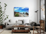 Wandbild auf Leinwand Neuseeland Strand runde Felsen Steine Sonnenuntergang