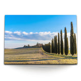 Leinwandbild Toskanische Landschaft Italien Bäume Finca - Dieses moderne und exklusive Wandbild ist ein echter Blickfang für Ihr Wohnzimmer, Schlafzimmer, Küche, Büro, Lounge, Garten oder anderen Einrichtungen. Dieser Fine Art Print wird auf hochwertiger Leinwand gedruckt und auf einen 2 cm starken Holzkeilrahmen gespannt. Gedruckt wird mit den besten Techniken auf dem Markt. Die Bilder bestechen durch eine sehr gute Farbqualität und Brillanz. Jedes Leinwandbild wird eigens in unserem Hause und individuell in Handarbeit (Made in Germany) angefertigt, somit ist ein hohes Maß an Qualität gewährleistet. Für deutsche Qualitätsware zum bestmöglichen Preis sind Sie bei uns genau richtig. Unsere Kunstdrucke eignen sich ideal als Geschenk zu Weihnachten, Ostern, Geburtstag, Hochzeit, Muttertag, Vatertag und andere Anlässen, für Freunde und Familie, egal ob alt oder jung. Damit auch Sie schöner Wohnen mit qualitativ hochwertigen Bildern auf echter Leinwand und Keilrahmen. Einfach auspacken, aufhängen und sich daran erfreuen. TIPP: Diese Dekoration ergänzt wunderbar Möbel wie z.B. Betten, Couch, Sofa, Tisch, Schrank, Küchen usw. gespannt. Traumhafte Accessoires für Ihr Zuhause.