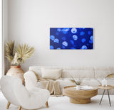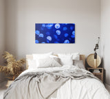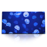 Leinwandbild 120x60cm Kleine Quallen unter Wasser Dunkelblau Ozean- Dieses moderne und exklusive Wandbild ist ein echter Blickfang für Ihr Wohnzimmer, Schlafzimmer, Küche, Büro, Lounge, Garten oder anderen Einrichtungen. Dieser Fine Art Print wird auf hochwertiger Leinwand gedruckt und auf einen 2 cm starken Holzkeilrahmen gespannt. Gedruckt wird mit den besten Techniken auf dem Markt. Die Bilder bestechen durch eine sehr gute Farbqualität und Brillanz. Jedes Leinwandbild wird eigens in unserem Hause und individuell in Handarbeit (Made in Germany) angefertigt, somit ist ein hohes Maß an Qualität gewährleistet. Für deutsche Qualitätsware zum bestmöglichen Preis sind Sie bei uns genau richtig. Unsere Kunstdrucke eignen sich ideal als Geschenk zu Weihnachten, Ostern, Geburtstag, Hochzeit, Muttertag, Vatertag und andere Anlässen, für Freunde und Familie, egal ob alt oder jung. Damit auch Sie schöner Wohnen mit qualitativ hochwertigen Bildern auf echter Leinwand und Keilrahmen. Einfach auspacken, aufhängen und sich daran erfreuen. TIPP: Diese Dekoration ergänzt wunderbar Möbel wie z.B. Betten, Couch, Sofa, Tisch, Schrank, Küchen usw. gespannt. Traumhafte Accessoires für Ihr Zuhause.