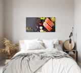 Leinwandbild 120x60cm Küchenbild Fisch Lachs Zitronen Küche Essen- Dieses moderne und exklusive Wandbild ist ein echter Blickfang für Ihr Wohnzimmer, Schlafzimmer, Küche, Büro, Lounge, Garten oder anderen Einrichtungen. Dieser Fine Art Print wird auf hochwertiger Leinwand gedruckt und auf einen 2 cm starken Holzkeilrahmen gespannt. Gedruckt wird mit den besten Techniken auf dem Markt. Die Bilder bestechen durch eine sehr gute Farbqualität und Brillanz. Jedes Leinwandbild wird eigens in unserem Hause und individuell in Handarbeit (Made in Germany) angefertigt, somit ist ein hohes Maß an Qualität gewährleistet. Für deutsche Qualitätsware zum bestmöglichen Preis sind Sie bei uns genau richtig. Unsere Kunstdrucke eignen sich ideal als Geschenk zu Weihnachten, Ostern, Geburtstag, Hochzeit, Muttertag, Vatertag und andere Anlässen, für Freunde und Familie, egal ob alt oder jung. Damit auch Sie schöner Wohnen mit qualitativ hochwertigen Bildern auf echter Leinwand und Keilrahmen. Einfach auspacken, aufhängen und sich daran erfreuen. TIPP: Diese Dekoration ergänzt wunderbar Möbel wie z.B. Betten, Couch, Sofa, Tisch, Schrank, Küchen usw. gespannt. Traumhafte Accessoires für Ihr Zuhause.