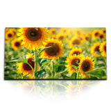 Leinwandbild 120x60cm Sonnenschein Sonnenblumen gelbe Blumen Sommer - Dieses moderne und exklusive Wandbild ist ein echter Blickfang für Ihr Wohnzimmer, Schlafzimmer, Küche, Büro, Lounge, Garten oder anderen Einrichtungen. Dieser Fine Art Print wird auf hochwertiger Leinwand gedruckt und auf einen 2 cm starken Holzkeilrahmen gespannt. Gedruckt wird mit den besten Techniken auf dem Markt. Die Bilder bestechen durch eine sehr gute Farbqualität und Brillanz. Jedes Leinwandbild wird eigens in unserem Hause und individuell in Handarbeit (Made in Germany) angefertigt, somit ist ein hohes Maß an Qualität gewährleistet. Für deutsche Qualitätsware zum bestmöglichen Preis sind Sie bei uns genau richtig. Unsere Kunstdrucke eignen sich ideal als Geschenk zu Weihnachten, Ostern, Geburtstag, Hochzeit, Muttertag, Vatertag und andere Anlässen, für Freunde und Familie, egal ob alt oder jung. Damit auch Sie schöner Wohnen mit qualitativ hochwertigen Bildern auf echter Leinwand und Keilrahmen. Einfach auspacken, aufhängen und sich daran erfreuen. TIPP: Diese Dekoration ergänzt wunderbar Möbel wie z.B. Betten, Couch, Sofa, Tisch, Schrank, Küchen usw. gespannt. Traumhafte Accessoires für Ihr Zuhause.