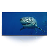 Leinwandbild 120x60cm Weißer Hai unter Wasser Blau Raubfisch Tierfotografie - Dieses moderne und exklusive Wandbild ist ein echter Blickfang für Ihr Wohnzimmer, Schlafzimmer, Küche, Büro, Lounge, Garten oder anderen Einrichtungen. Dieser Fine Art Print wird auf hochwertiger Leinwand gedruckt und auf einen 2 cm starken Holzkeilrahmen gespannt. Gedruckt wird mit den besten Techniken auf dem Markt. Die Bilder bestechen durch eine sehr gute Farbqualität und Brillanz. Jedes Leinwandbild wird eigens in unserem Hause und individuell in Handarbeit (Made in Germany) angefertigt, somit ist ein hohes Maß an Qualität gewährleistet. Für deutsche Qualitätsware zum bestmöglichen Preis sind Sie bei uns genau richtig. Unsere Kunstdrucke eignen sich ideal als Geschenk zu Weihnachten, Ostern, Geburtstag, Hochzeit, Muttertag, Vatertag und andere Anlässen, für Freunde und Familie, egal ob alt oder jung. Damit auch Sie schöner Wohnen mit qualitativ hochwertigen Bildern auf echter Leinwand und Keilrahmen. Einfach auspacken, aufhängen und sich daran erfreuen. TIPP: Diese Dekoration ergänzt wunderbar Möbel wie z.B. Betten, Couch, Sofa, Tisch, Schrank, Küchen usw. gespannt. Traumhafte Accessoires für Ihr Zuhause.