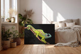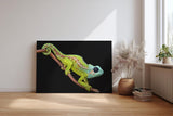 Das Bild - leuchtend grünes Chamäleon auf einem Ast vor schwarzem Hintergrund Die detailreiche Hautstruktur, die lebendigen Farben und die konzentrierte Haltung des Tiers machen das Bild zu einem echten Hingucker Besonders auf der dunklen Leinwand wirkt das Motiv kontrastreich und eindrucksvoll Der Druck auf Leinwand garantiert eine brillante Darstellung, während der stabile Echtholzrahmen für einen sicheren Halt sorgt Dieses Wandbild eignet sich hervorragend für naturinspirierte Räume, Kinderzimmer oder als kreatives Statement in modernen Wohnumgebungen Die Produktion erfolgt nachhaltig mit lösungsmittelfreier Tinte und umweltfreundlichen Materialien