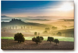 Leinwandbild - toskanische Landschaft in den frühen Morgenstunden Sanfte Hügel und Felder liegen im goldenen Licht der aufgehenden Sonne das sich über den Dunst der Ebene legt Zypressen und Olivenbäume setzen mediterrane Akzente und vermitteln Ruhe und Harmonie Der hochwertige Druck auf Leinwand bringt die sanften Farbverläufe und die Lichtstimmung eindrucksvoll zur Geltung Die Leinwand ist auf einem formstabilen Echtholzrahmen gespannt der für eine hochwertige Präsentation sorgt Dieses Motiv eignet sich ideal für Wohnräume oder Essbereiche die eine natürliche und entspannte Atmosphäre ausstrahlen sollen Die Herstellung erfolgt nachhaltig mit umweltfreundlichen Materialien und lösungsmittelfreier Tinte