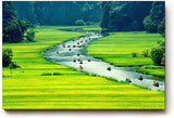 Leinwandbild - eindrucksvolle Szene aus einer asiatischen Reislandschaft Zahlreiche kleine Boote schlängeln sich durch einen schmalen Fluss der sich zwischen leuchtend grünen Feldern windet Das Bild vermittelt Ruhe Weite und kulturelle Tiefe und ist ein Ausdruck von Fernweh und Entdeckungsfreude Die leuchtenden Farben und die klare Perspektive erzeugen eine starke räumliche Wirkung Das Wandbild ist auf hochwertiger Leinwand mit lösungsmittelfreien UV-beständigen Tinten gedruckt und auf einen robusten Echtholzrahmen gespannt Nachhaltigkeit und Qualität stehen bei diesem Produkt im Fokus Es eignet sich ideal für Wohnräume Essbereiche oder Orte an denen das Gefühl von Weltverbundenheit erwünscht ist
