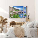 Wandbild Fensterbild Amalfiküste Italien Mittelmeer Küstendorf Sommer - Dieses moderne und exklusive Wandbild ist ein echter Blickfang für Ihr Wohnzimmer, Schlafzimmer, Küche, Büro, Lounge, Garten oder anderen Einrichtungen. Dieser Fine Art Print wird auf hochwertiger Leinwand gedruckt und auf einen 2 cm starken Holzkeilrahmen gespannt. Gedruckt wird mit den besten Techniken auf dem Markt. Die Bilder bestechen durch eine sehr gute Farbqualität und Brillanz. Jedes Leinwandbild wird eigens in unserem Hause und individuell in Handarbeit (Made in Germany) angefertigt, somit ist ein hohes Maß an Qualität gewährleistet. Für deutsche Qualitätsware zum bestmöglichen Preis sind Sie bei uns genau richtig. Unsere Kunstdrucke eignen sich ideal als Geschenk zu Weihnachten, Ostern, Geburtstag, Hochzeit, Muttertag, Vatertag und andere Anlässen, für Freunde und Familie, egal ob alt oder jung. Damit auch Sie schöner Wohnen mit qualitativ hochwertigen Bildern auf echter Leinwand und Keilrahmen. Einfach auspacken, aufhängen und sich daran erfreuen. TIPP: Diese Dekoration ergänzt wunderbar Möbel wie z.B. Betten, Couch, Sofa, Tisch, Schrank, Küchen usw. gespannt. Traumhafte Accessoires für Ihr Zuhause.